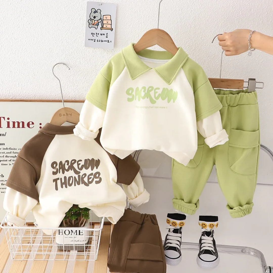 A stylish three-piece boys’ set featuring coordinated beige and brown tones. Includes comfortable, mix-and-match pieces perfect for everyday wear, offering a clean and classic look.
