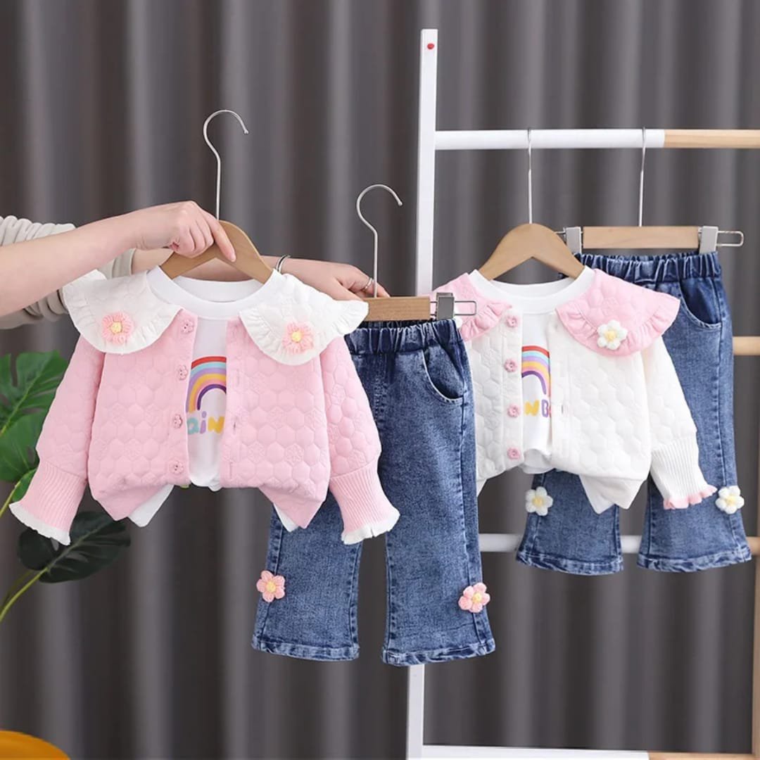 A stylish purple and white 3-piece jeans outfit featuring coordinated denim pieces and a matching top for a fresh, modern look.”